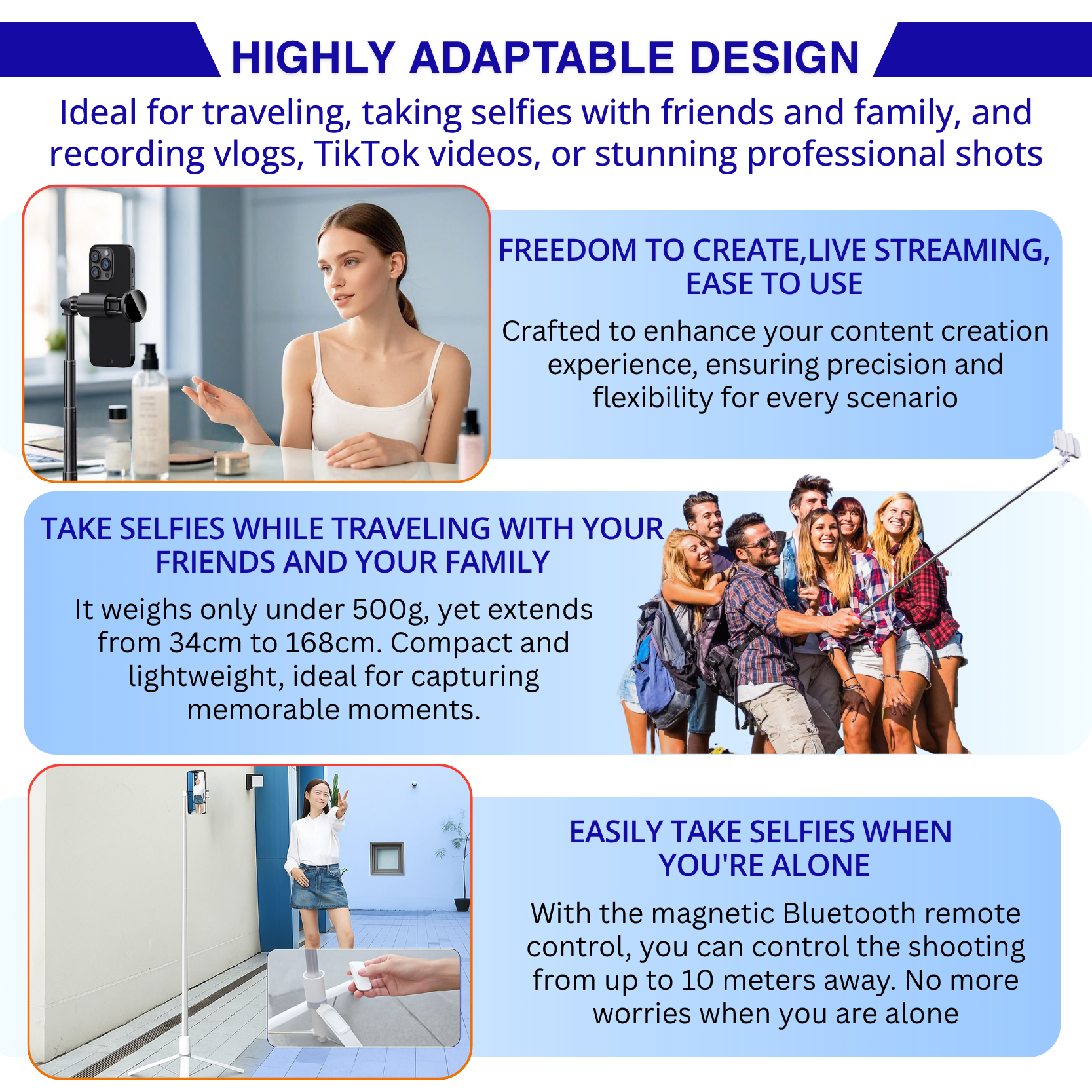Crafted from carbon fiber aluminum alloy, it weighs only under 500g, yet extends from 34cm to 168cm. Carry it anywhere, use it all day — zero fatigue.